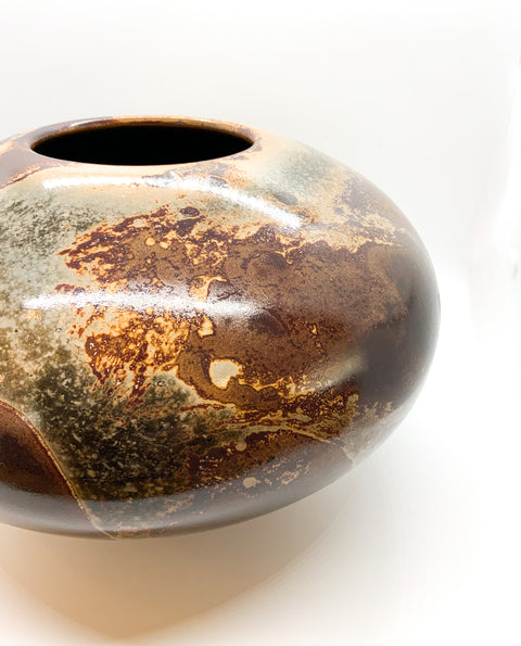 The first is a low-temperature salt firing; the second is a sawdust firing. Both firings produce random, chaotic markings on the surface of each pot. The wax resist separates the effects caused by each process into distinct areas, defining the patterns without losing the vitality of chaos.