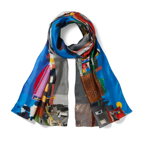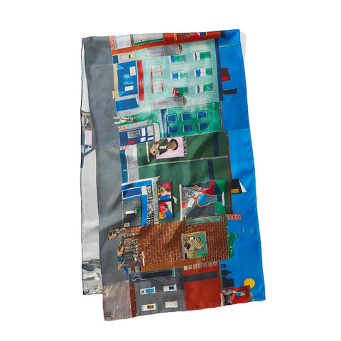 Romare Bearden's (American, 1911–1988) exuberant tribute to Harlem is a celebration of the lively New York City neighborhood that nurtured his life and work. Though he was born in North Carolina, Bearden spent formative time in Harlem as a child, and in 1940, he established a studio in the same West 125th Street building as the artist Jacob Lawrence. Each of the six panels that make up The Block (1971), reproduced on this 100% silk-twill scarf with a hand-rolled hem, represents an aspect of local life, from the barbershop to the corner store.